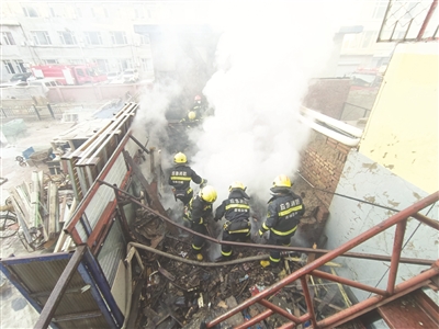 急促的警铃响起,市消防救援支队海明西路消防救援站政治指导员韩英磊和队友们迅速跑至车库、穿灭火服、蹬车,不到一分钟,消防车响起警报驶出车库。火灾现场火势凶猛,滚滚浓烟翻滚而出,室内有2个液化气罐,其中一个气罐因阀门受损正“嘶嘶”作响喷着火舌。浓烟中消防员的身影时隐时现,韩英磊沉着果断指挥,消防员任玉鑫、王化磊密切配合,用水枪扑控明火。高温炙烤,液化气罐随时都有爆炸危险,他们不惧危险,将喷着火舌的气罐安全搬离。