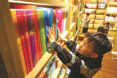 4月22日,小朋友在贵州省毕节市七星关区书香门第书店里挑选书籍。