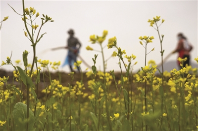 4月27日,农民在河北省遵化市山里各庄村油菜花田间浇水。