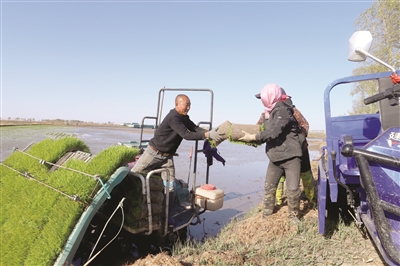 嘎什根乡后围子村村民徐康正同家人在水田里劳作,插秧机匀速前进,他在前面驾驶插秧机,妻子在后面排秧,一株株秧苗在插秧机苗盘上有节奏地滑落,稻苗整齐有序地插入水田里。