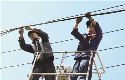 近段时间,市城管局联合移动、联通、电信、吉视传媒、电力等部门,对“空中飞线”开展专项整治。图为施工人员对空中缆线进行捆扎。 本报记者张殿文摄
