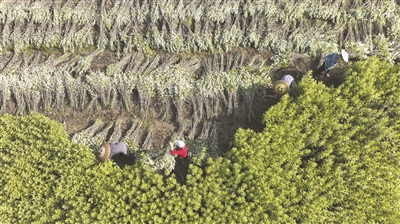 5月29日,在常宁市洋泉镇西南村艾草种植基地,农民在收割艾草(无人机照片)。