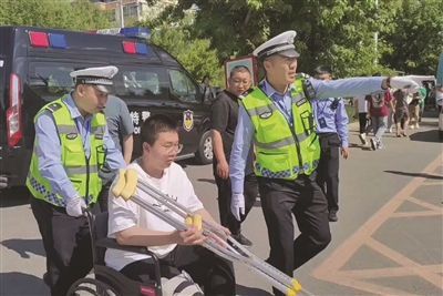 高考一个月前,大安市公安局交巡警大队民警接到了辖区居民陈先生求助称:儿子小宇因打篮球不慎将大腿摔伤,为了不影响小宇参加高考,向民警求助。得知情况后,6月7日高考当天一大早,民警提前与陈先生取得联系,为小宇开辟高考“绿色通道”,两名民警全程护送小宇进出考场。同时,民警鼓励小宇不要被伤痛影响高考,努力加油考出优异成绩!