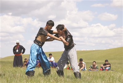 七月一日,小选手们在草地上参加搏克比赛。