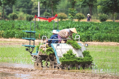 7月13日,在岩汪湖镇武竺山村,农民驾驶插秧机进行水稻插秧作业。
