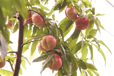 “这蟠桃果大、皮薄、汁多、香甜,既有黄桃的爽脆,又有水蜜桃的甘甜。”采摘园中,游客拿着手拎筐,一边采摘一边品尝着鲜美的蟠桃,赞不绝口。