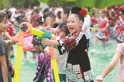 7月22日至25日,“中国·剑河2023年‘六月六’仰阿莎文化节”在贵州省黔东南苗族侗族自治州剑河县举行。文化节期间,当地开展民族文化展演、水鼓舞表演、水龙狂欢、民歌大赛等丰富多彩的活动,欢度仰阿莎文化节。 新华社发(方鹏摄)