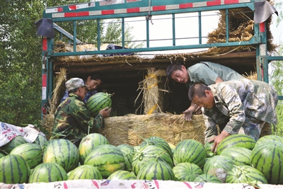 日前,通榆县开通镇前青村种植的西瓜喜获丰收。皮薄爽口、又甜又脆的西瓜吸引许多外地客商前来批发选购,为村民带来了可观的经济效益。图为村民将西瓜装车销售。 陈宝林摄