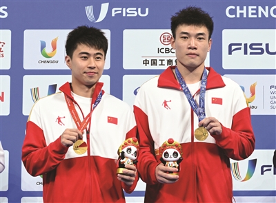 当日,在成都举行的第31届世界大学生夏季运动会男子双人三米跳板决赛中,中国组合黄博文/梁朝辉以397.35分的成绩夺得冠军。 新华社记者刘坤摄