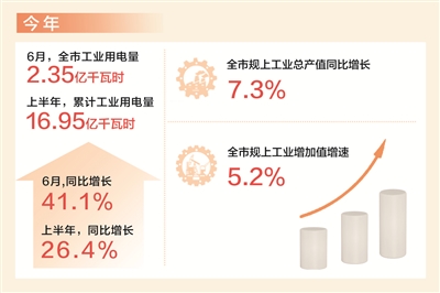 6月,全市工业用电量2.35亿千瓦时,同比增长41.1%;上半年累计工业用电量16.95亿千瓦时,同比增长26.4%,当月和累计增速均居全省第一位;