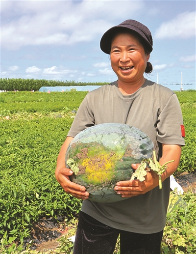 八月六日,洮南市黑水镇黑水村村民高春莲抱着二三十斤重的大西瓜笑得合不拢嘴。据了解,近期黑水西瓜陆续上市,优良的品质加上镇党委、政府的全力推介,黑水西瓜畅销全国,供不应求,村民收入也非常可观。 本报记者李晓明摄