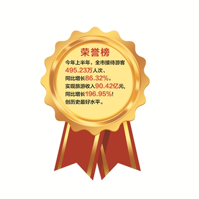 今年上半年,全市接待游客495.23万人次,同比增长86.32%;实现旅游收入90.42亿元,同比增长196.95%!创历史最好水平。