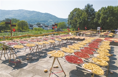 地处皖南山区的安徽省黄山市徽州区呈坎古村自古都有晒秋习俗。近年来,晒秋时节,该村村民会将农作物在村中广场集中晾晒,构成一幅五谷丰登的秋收画卷,吸引不少游客前往观赏,成为当地秋日里的旅游特色。 新华社记者 郭晨摄