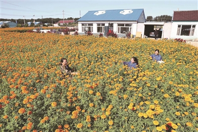 近年来,镇赉县在推进“一村一品”上下大功夫、花大力气,积极发展庭院经济,使当地农民多了一条增收致富的新路子。图为莫莫格蒙古族乡乌兰昭村的种植户采摘万寿菊。 丁研摄