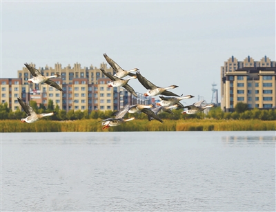 金秋十月,位于镇赉南湖国家湿地公园南端的天鹅岛“口袋公园”,以其独特的魅力吸引着八方游客。岛内的天鹅、孔雀、鸵鸟、大雁等十几种观赏性鸟类更吸引游客纷纷拍照留念。图为大雁在湖面上自由翱翔。 徐辉摄
