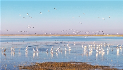 近日,镇赉莫莫格湿地迎来了秋季候鸟迁徙高峰。金叶、碧水、蓝天,伴随着候鸟的歌唱,构成了一个五彩斑斓的世界。图为10月11日,1000多只白鹤到达莫莫格湿地停歇补给。 本报记者李晓明摄