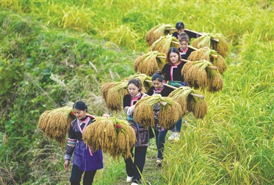 10月11日,村民在贵州省从江县高增乡建华村挑运香禾糯稻谷。