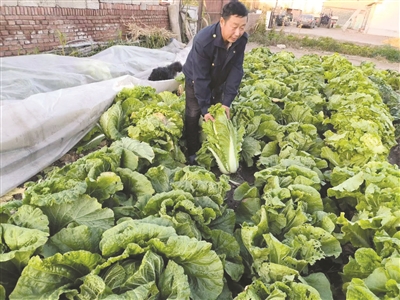 近年来,洮北区东胜乡有利村积极发展庭院经济,引导农户种植有机蔬菜,增加农民收入。今年,全村共有100余户农户种植优质白菜,平均每户增收500元以上。图为脱贫户王永正在收获大白菜。 李弘恩摄