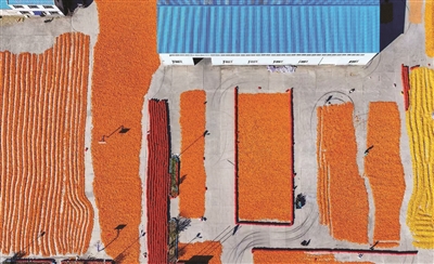 近日,国家级玉米制种基地洮南市呼和车力蒙古族乡制种玉米进入收获季。该乡具有得天独厚的地理优势,种植的玉米颗粒饱满,市场前景广阔。图为基地晾晒制种玉米鸟瞰。 本报记者 李晓明摄