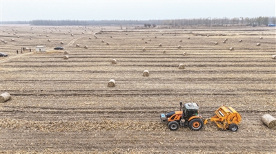 随着秋季收割工作接近尾声,通榆县乌兰花镇积极推进秸秆禁烧工作,将收割完毕的玉米和水稻秸秆进行打捆处理,打包后的秸秆将为村民供热。图为乌兰花镇陆家村田地里,秸秆打捆机器在有序作业。 王晓驰 本报记者李晓明摄