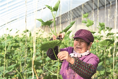 初冬时节,在甘肃省平凉市泾川县泾汭河川区万亩设施蔬菜产业园王村核心区,黄瓜、芹菜等蔬菜长势喜人,人们忙着在大棚内管护蔬菜。该核心区是泾川县近年来依托天津市东西部协作帮扶资金实施的联建项目。 新华社记者范培珅摄
