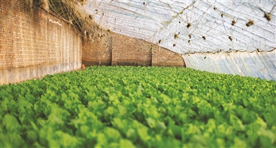 走进被塑料膜和棉被保护的大棚内,这里的大棚面向日光照射最长的方向,只靠采光就能生产。不仅如此,棉被还可以把中午多余的热量储存起来,用于弥补夜晚热量的散失。仔细观察就会发现,离光线近的地方植株密,越靠后墙越稀疏。为此,农户们在后方的砖墙上粘贴了反光膜,这样可使日光通过折射的作用让大棚内的温度得以均衡,使作物均匀健康地生长。该村农户高立新说:“今年我家种了4栋大棚,头一茬种黄瓜,这一茬种白菜,通过这种科学的手段既能保证质量,还能保证产量,我一年的纯收入也达到了七八万元。”
