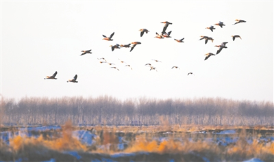 时值冬季,在洮儿河部分没有结冰的河段,成群的赤麻鸭或在水面嬉戏觅食,或在空中展翅飞翔,呈现出一幅生态和谐的美丽画卷。 本报记者李晓明摄