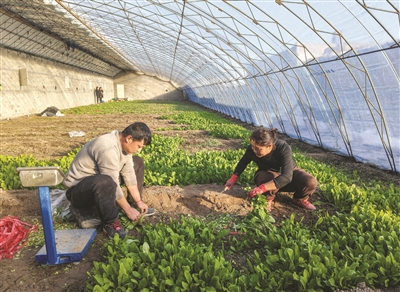 近年来,洮南市洮府街道福胜村依托城市郊区发展棚膜经济,不仅在冬季丰富了周边地区市民的菜蓝子,也成为村民致富的重要方式。图为村民正在暖棚内打捆青菜,准备送往多地蔬菜批发市场。 邱会宁 范海辉摄