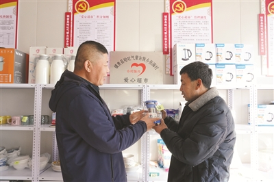 吉林省信用担保投资集团有限公司员工徐万财在镇赉县哈吐气蒙古族乡哈吐气村和张海村驻村五年来,积极帮助脱贫户、残疾人和年老体弱家庭,用实际行动彰显党员的为民情怀。徐万财二0一九年被镇赉县评为“镇赉县优秀志愿者”,连续三年被本单位评为“驻村工作先进个人”。图为徐万财(左)在“爱心超市”帮助村民用积分兑换生活用品。 王凯摄