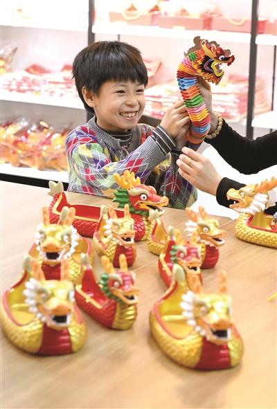 1月14日,小朋友在河北省石家庄市一家文创企业欣赏创意年货饰品。