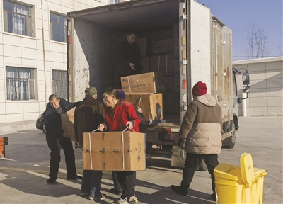 图为服务中心工作人员为走访单位送医疗物资。 本报记者张殿文摄