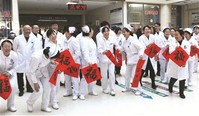 日前,洮南市古城翰墨书画社的书法家们来到洮南市人民医院,为一线医务人员以及来此帮扶的锦州医科大学附属第一医院的医务人员和部分患者送春联、福字。图为医务人员拿着春联和福字喜笑颜开。 刘鑫 本报记者王野村摄