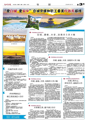 1.嫩江湾旅游区参观。旅游区位于“中国休闲垂钓之乡”大安市境内,距城区仅1公里。景区总面积3.5平方公里,先后被评为国家森林公园、国家湿地公园、国家级水利风景区,在此参观老坎子码头、辽皇观鱼台、华夷同风院等大小景点百余处。