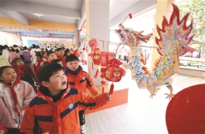 2月26日,湖北省襄阳市海容小学学生在校园观赏剪纸绘画灯笼等作品。