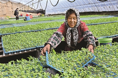 2月28日,明村镇大黄埠村高标准育苗基地产业园员工在分拣蔬菜幼苗。