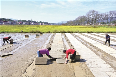 3月12日,在湖南省娄底市双峰县荷叶镇清泉村集中育秧点,农民在秧田劳作。 时下,各地农民抢抓农时开展春季农业生产,田间地头一派生机勃勃的农忙景象。 新华社发(李建新摄)