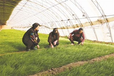 洮南市洮府街道办事处农民李英波(中)多年来依托地处市近郊的地域优势,搭建十五个大棚进行圆葱育苗和种植反季节叶菜、瓜果,年收入可达五十余万元。 本报记者李晓明摄
