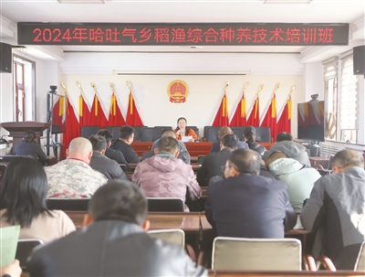 在哈吐气蒙古族乡,各村党组织书记、包村干部和农民代表50余人参加了水产总站技术人员围绕稻渔综合种养及稻田成蟹养殖技术开展的培训。技术人员结合当地实际,从稻田选择、田间准备及生产计划、苗种选购等方面进行了具体指导,并现场解答了农户们关于技术常识和种养等方面的关键问题。