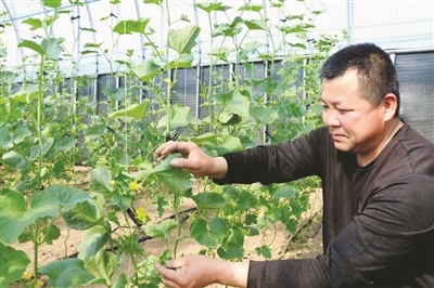 通榆县乌兰花镇永安屯农民张德新有3个暖棚、11个冷棚,占地7000多平方米。采用南瓜,哈密瓜嫁接的方式,种植丑瓜、八里香、博阳九等品种的香瓜,每年可收入20余万元,并带动周边农户种植香瓜,受到村民好评。 本报记者 张殿文摄