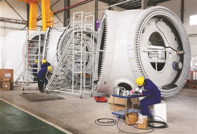 目前,东方电气(通榆)新能源装备制造基地正在进行兴安盟突泉35台6.25MW风力发电机装配工作。据了解,该企业今年年度排产计划达128台。图为装配车间工人正在进行轮毂润滑装配。于昊然 本报记者 李晓明摄