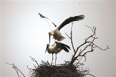 近年来,吉林向海国家级自然保护区生态承载力明显提升,生态环境质量总体改善,生物多样性得到保护和发展。图为在向海自然保护区内的人工招引巢中,一对东方白鹳成功安家,繁衍后代。 于昊然 本报记者李晓明摄