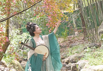 4月14日,汉服爱好者在浙江省台州市仙居县永安公园游玩。