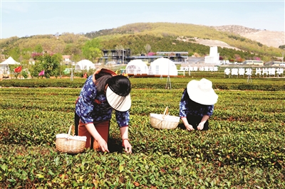4月16日,在日照市岚山区巨峰镇,茶农在采摘鲜茶。