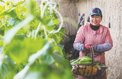 洮南市洮府街道办事处福胜村村民周淑均依托近郊优势,利用3个温室大棚种植蔬菜,收益可观。眼下,新鲜黄瓜已经上市。 本报记者李晓明摄