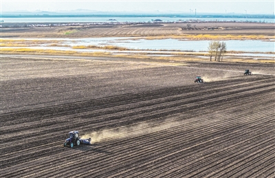 春暖花开,万物复苏,白城大地又到了播种的季节。寂静一冬的田野春潮涌动,铁牛轰鸣穿梭于田地之间,翻地、打垄、点种一气呵成,播撒下新一年的希望。图为航拍洮北区岭下镇玉米播种现场。 本报记者李晓明摄
