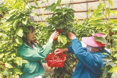 洮南市向阳街道凤凰山采摘园引进优质特色苗木,通过棚膜种植、错季采摘吸引游客源源不断。图为近日游客在釆摘樱桃。 邱会宁 范海辉摄