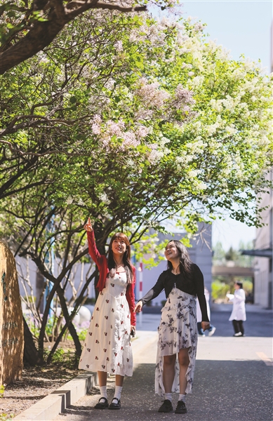 满目丁香,一路芬芳。5月8日,白城师范学院第二届丁香文化节启幕,人们徜徉在丁香林中,如痴如醉。文化节为期一个月,将开展教学教育、学术科研、学习管理、招生就业、文艺体育等系列活动。图为学生在欣赏丁香美景。 本报记者李晓明摄