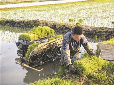 近年来,镇赉县嘎什根乡乌林锡伯村农民在驻村工作队指导和帮助下,强化水稻生产,推动了农业增产和农民增收。图为村民刘国臣在种植水稻,今年刘国臣种水稻5公顷,年收入预计可达14万元。 潘晓戬 本报记者张殿文摄