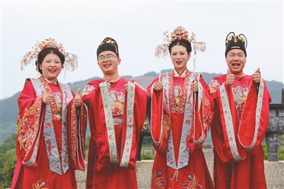 五月二十日,在湖北省十堰市郧阳区武当不夜城,新人们参加集体婚礼。