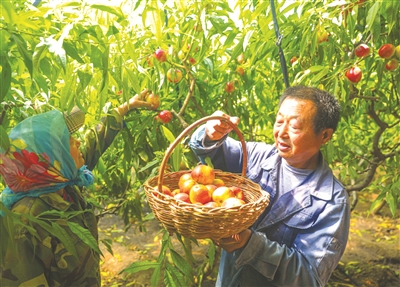 近日,洮南市二龙乡保民村村民李玉国家种植的油桃开园。李玉国凭借多年累积的经验,将油桃栽培得果实饱满、味道清甜,吸引许多游客前去采摘。图为李玉国夫妇在采摘成熟的油桃。 邱会宁 范海辉摄